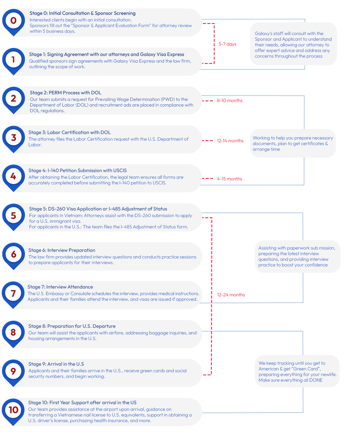 Today, with over 15 years of experience, the company has identified a major issue within the Vietnamese community in the U.S: the lack of a high-quality workforce and the difficulties in immigration procedures. To bridge this gap, the company decided to establish Galaxy Visa Express, offering EB-3 Employment-Based Residency services.